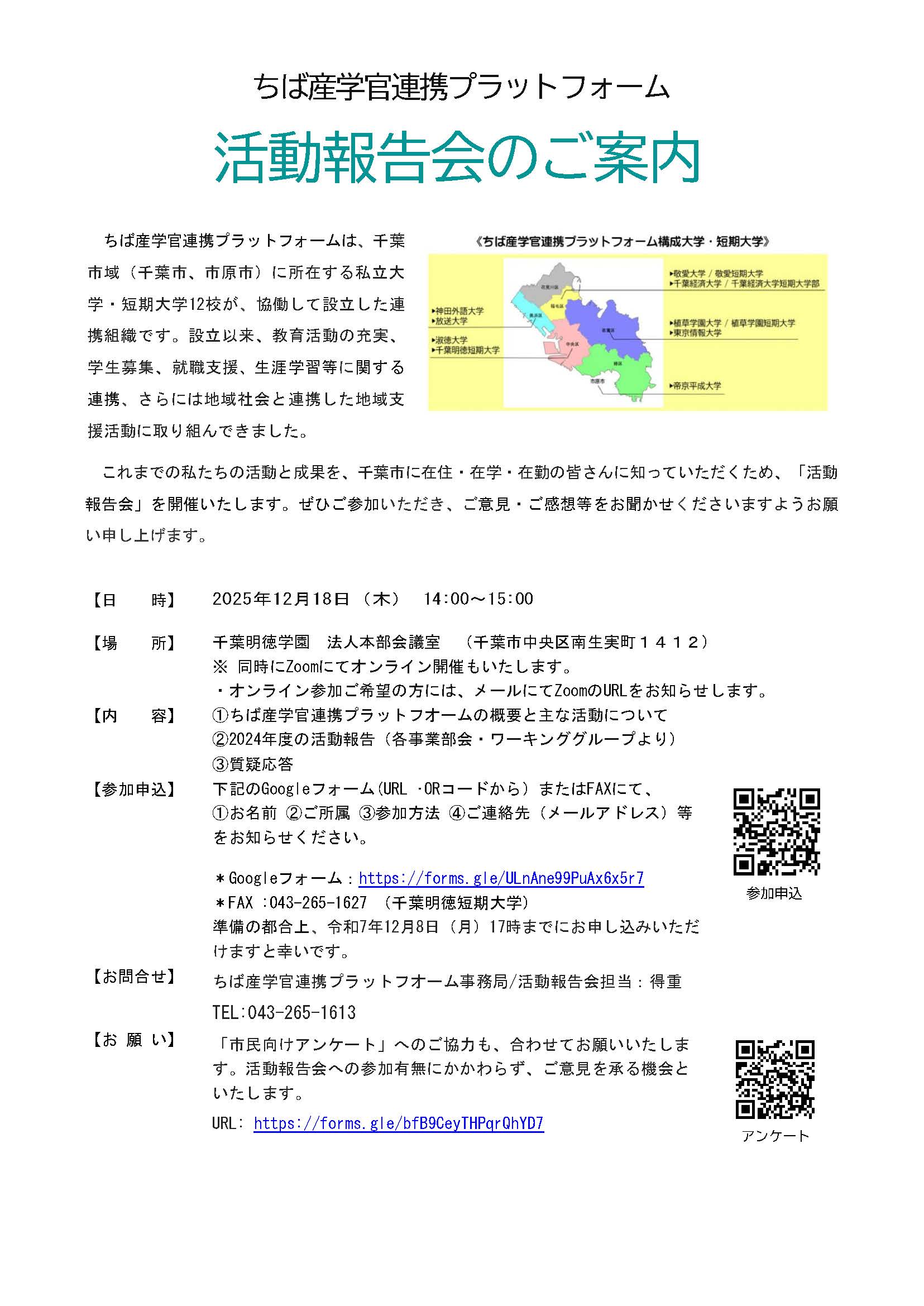 東京情報大学が参画する「ちば産学官連携プラットフォーム」では、このたび活動報告会を実施することとなりました。