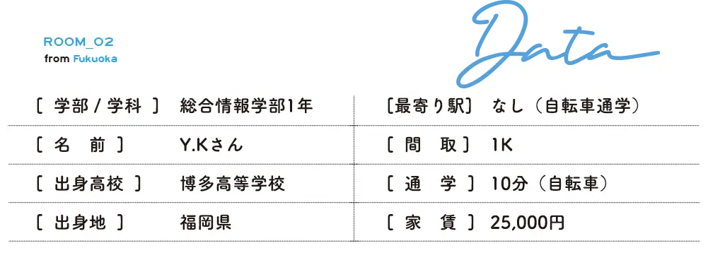 福岡県福岡市出身のY.Kさんは、将来のヴィジョンを見据えた上で東京情報大学に入学し、大学近くで一人暮らしをはじめた。彼が暮らす部屋は、生活の基盤である以上に、「自分のやりたいことを実現していくための場所」でもあった。