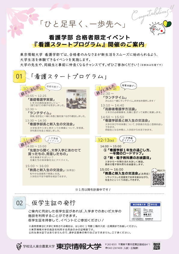 看護学部では、合格者のみなさまが新生活をスムーズに始められるよう、大学の授業を体験できるイベント、入学準備のガイダンスを月に一回実施します。